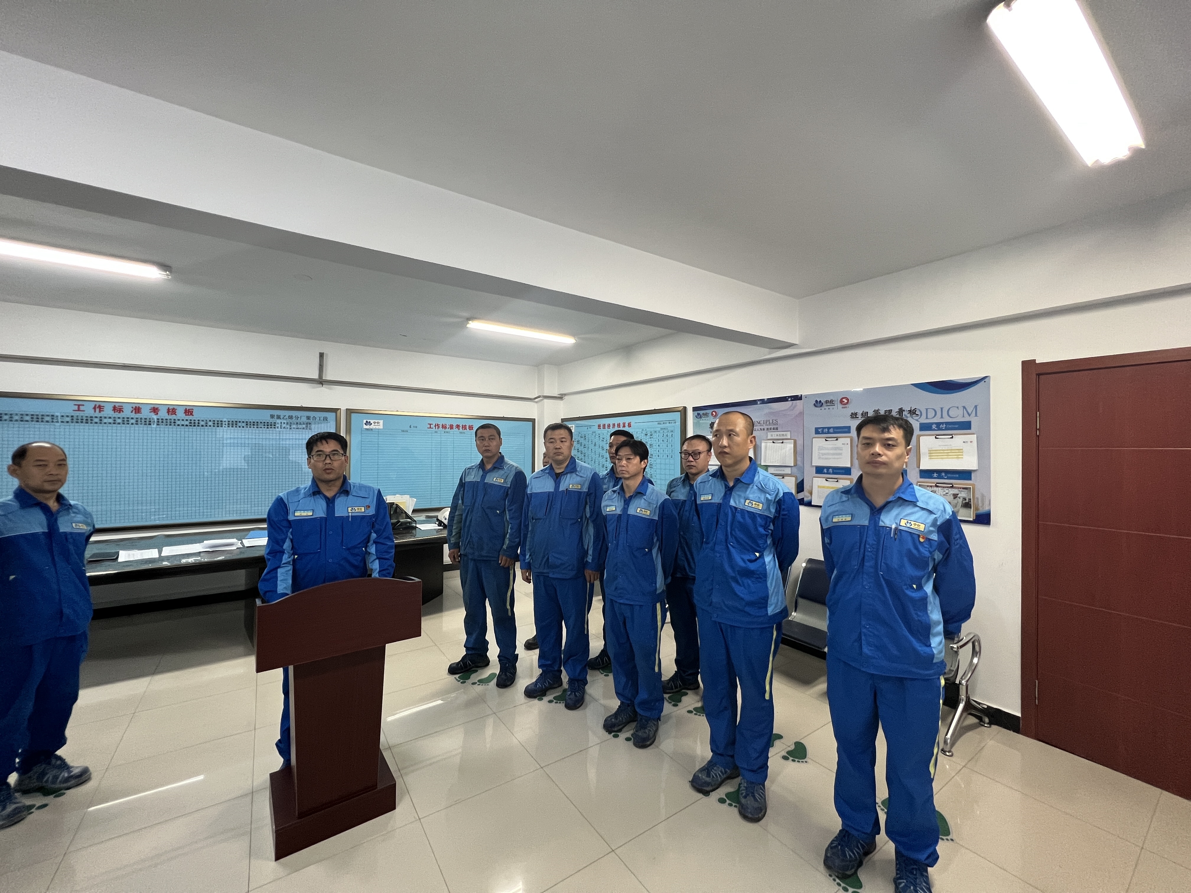聚合工段T1会议的现场,班组考勤环节过后在主持人的引领下,班组成员们异口同声、清澈洪亮的喊出了班组口号。